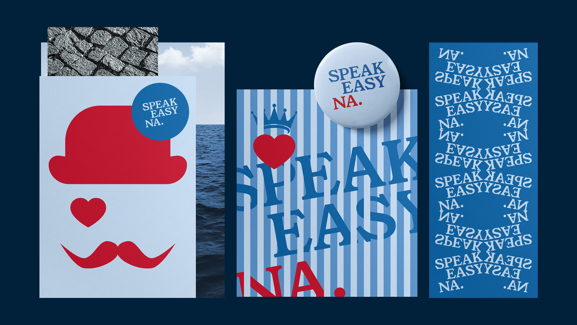L’identità visiva di Speakeasy Na. nasce dall’incontro tra l’animo partenopeo e la cultura anglosassone. La palette cromatica bilancia con forza e armonia tonalità di blu e rosso, creando un contrasto dinamico che trasmette energia, passione e apertura. I pittogrammi richiamano simboli iconici britannici e si intrecciano con forme che evocano vitalità e connessione. Il lettering graziato del logo, ispirato all’architettura barocca napoletana, conferisce eleganza e personalità, mentre il movimento dinamico delle forme trasmette slancio, internazionalità e energia, comunicando un senso di vitalità e connessione continua.
