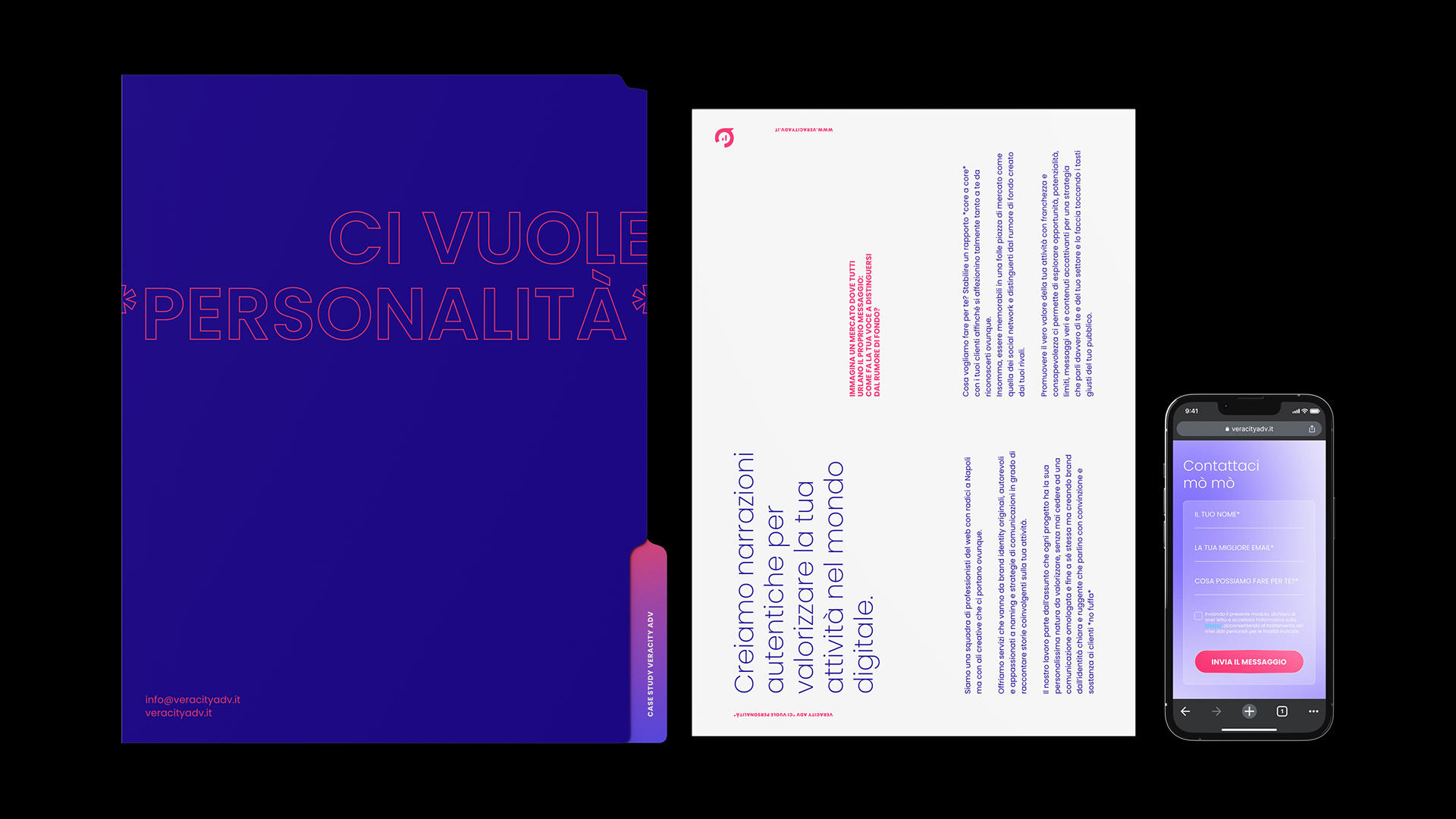 Il progetto Veracity è nato da una sinergia collaborativa dalle idee chiare: costruire un’identità visiva di un’agenzia web in grado di raccontare l‘anima più autentica dei brand con uno stile diretto, riconoscibile e senza compromessi. In un mondo saturo di immagini e parole vuote, Veracity sceglie uno storytelling fatto di concretezza, trasparenza e unicità.