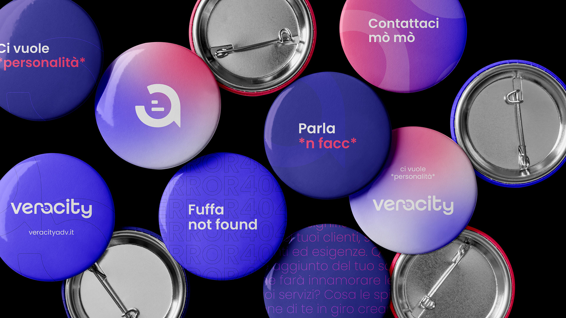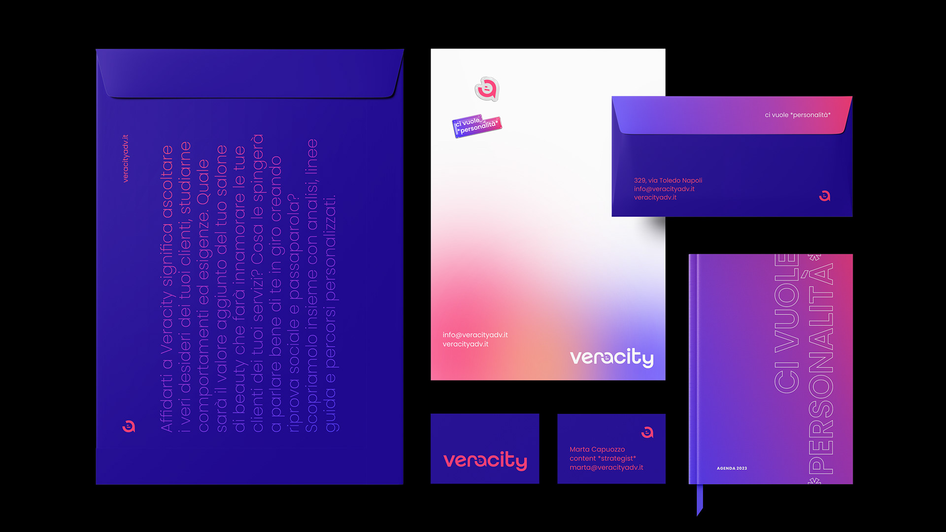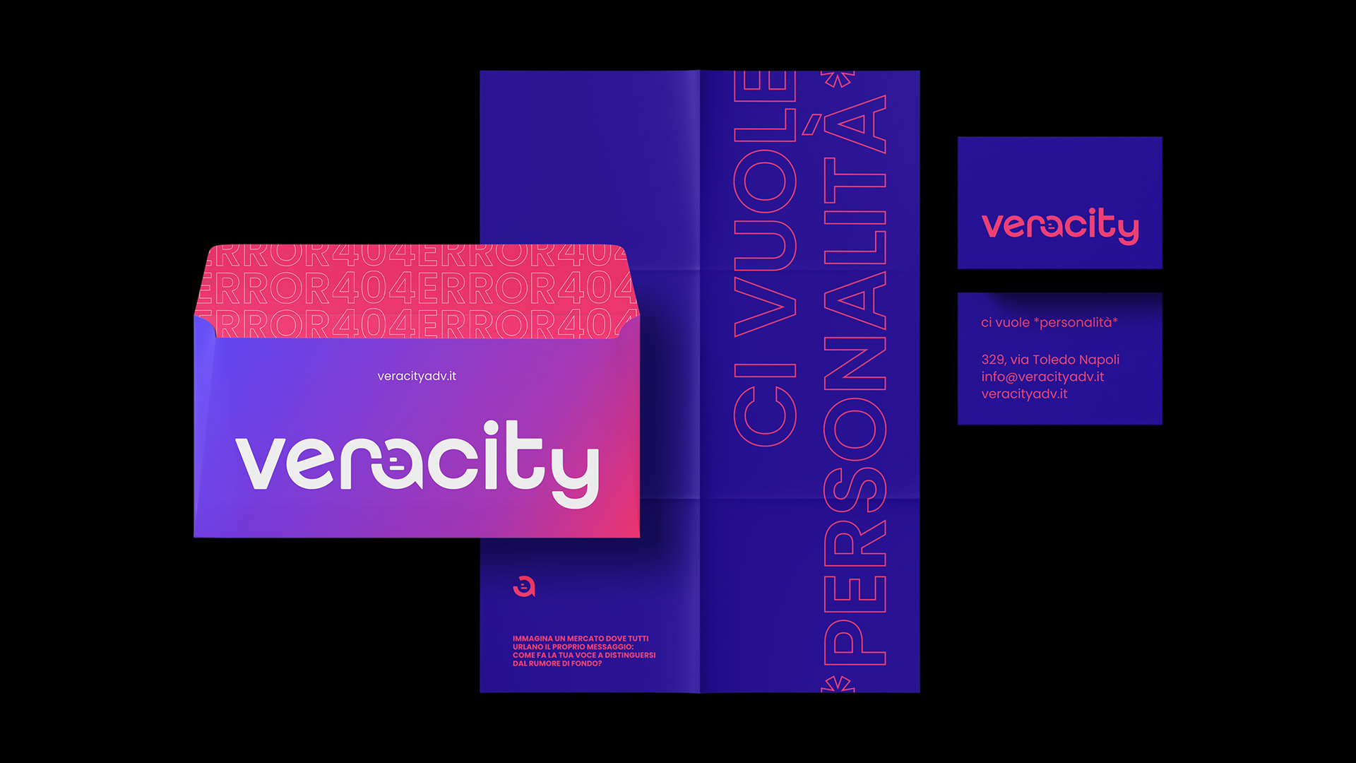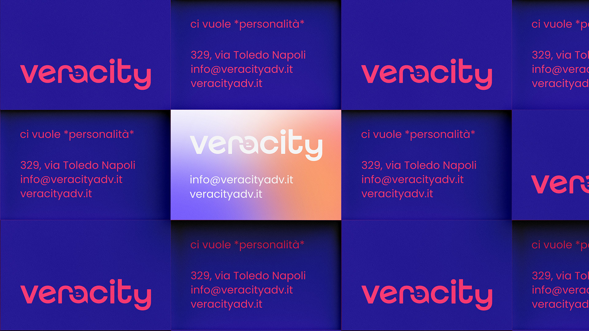 Veracity non vuole raccontare storie fake, ma ‘parlare in faccia’ e valorizzare l’essenza più profonda dei suoi clienti, rendendola tangibile e memorabile. Ogni strategia di comunicazione è pensata per trasmettere messaggi veri, usando un linguaggio diretto, coinvolgente e coerente con la personalità aziendale. L’identità visiva ha voluto quindi tradurre questi valori in un sistema grafico che esalta la personalità del marchio: colori elettrici, forme audaci e contrasti netti diventano strumenti espressivi per catturare l’attenzione e imprimere un’immagine forte, coerente e divertente nella mente del pubblico.