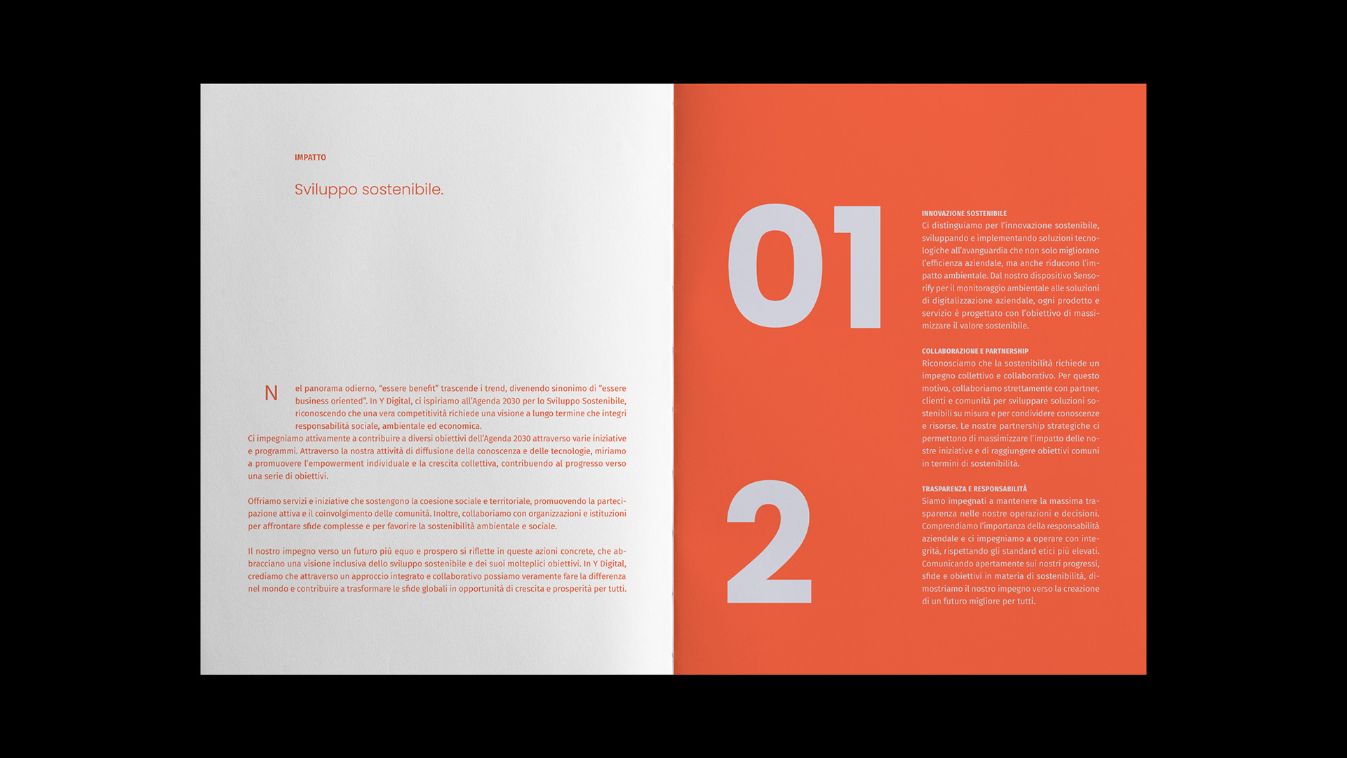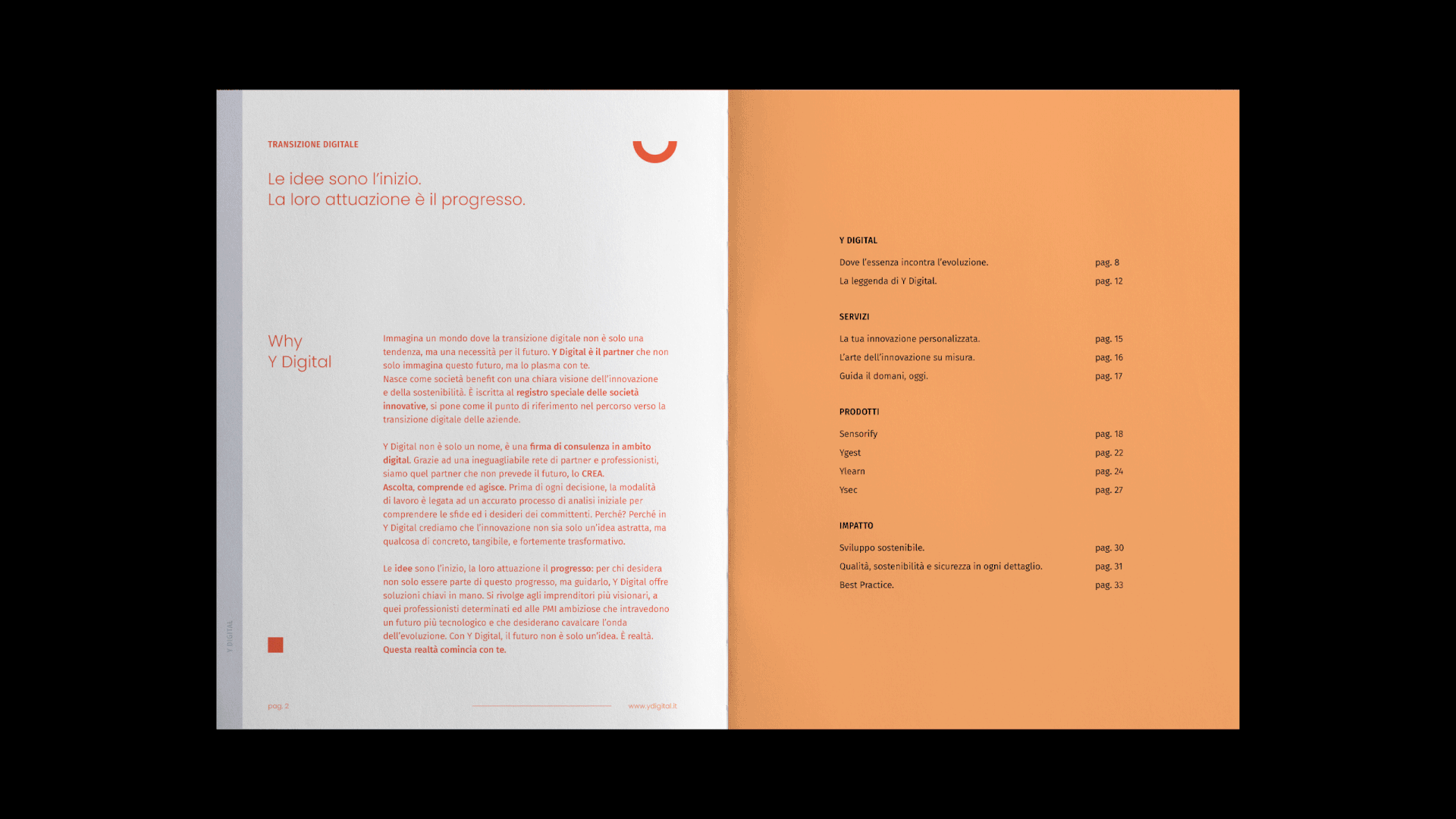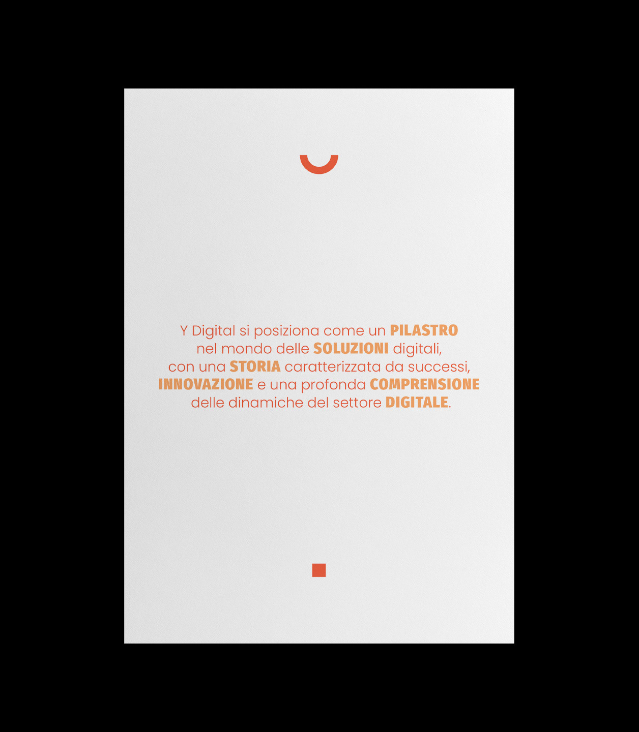Ogni pagina è una composizione in cui la forma grafica diventa contenuto, con uno storytelling visivo che riflette i valori fondanti di Y Digital: ricerca, innovazione, solidità e apertura al futuro.