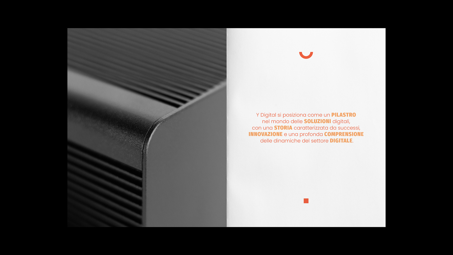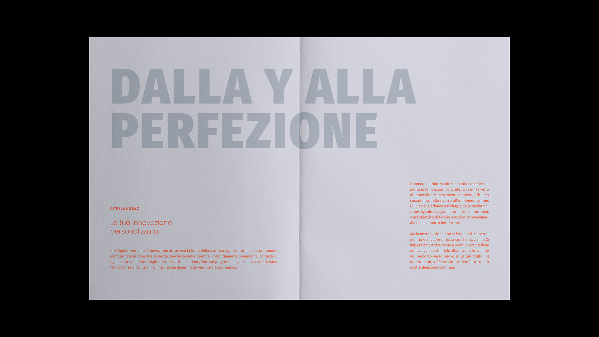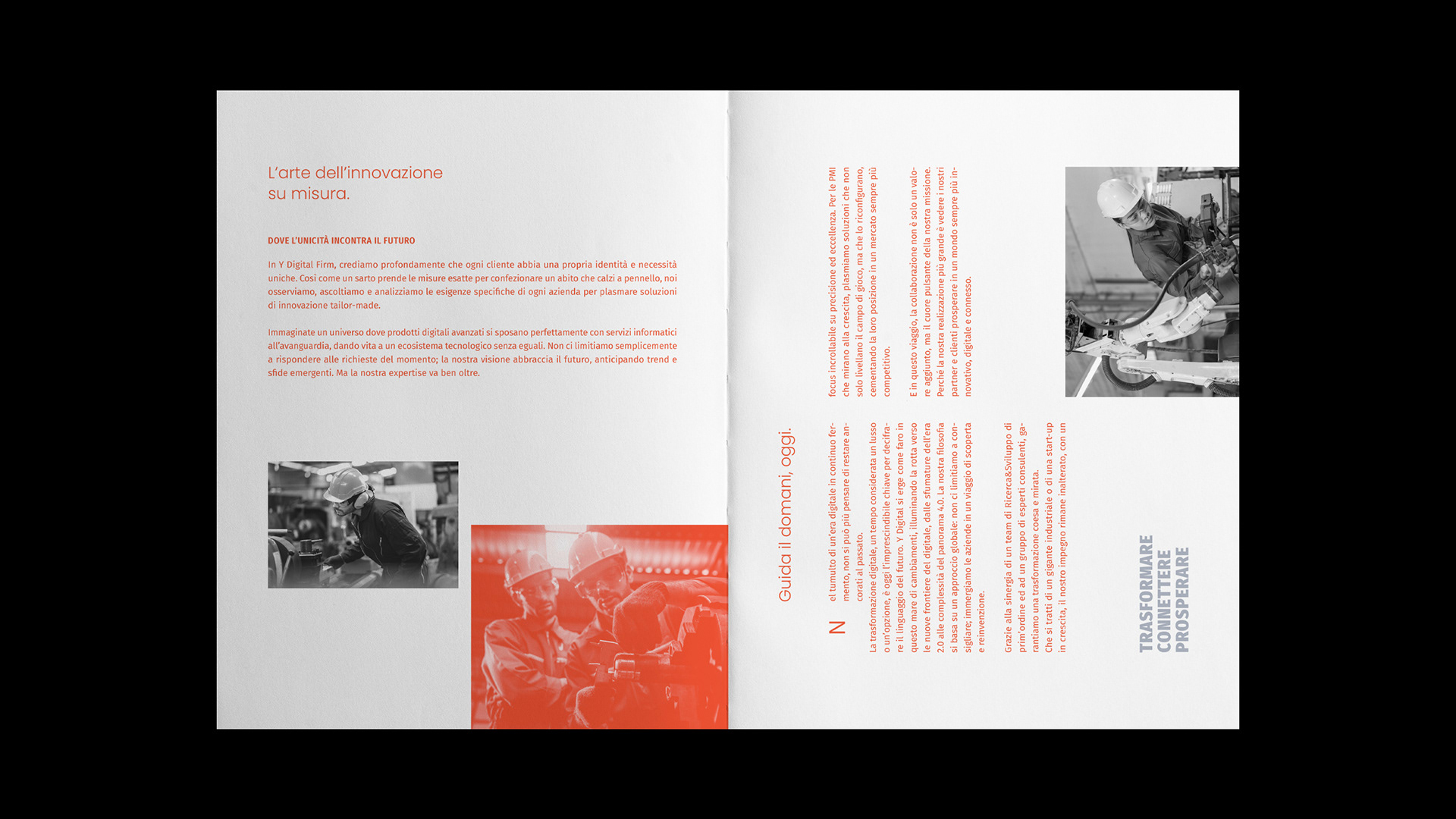Insieme a Y Digital abbiamo progettato un nuovo company profile che va oltre la funzione informativa e si afferma come manifesto visivo dell’identità aziendale. Un oggetto editoriale capace di trasmettere, attraverso ogni dettaglio grafico, tipografico e materico, la visione innovativa dell’azienda e il suo ruolo guida nella transizione digitale.